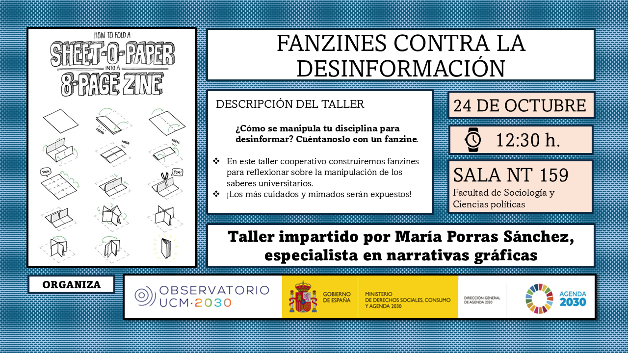 En este taller, dirigido por María Porras Sánchez, especialista en narrativas gráficas, exploraremos cómo los fanzines pueden convertirse en herramientas creativas para cuestionar la desinformación. A través del dibujo, el collage y la reflexión colectiva, aprenderemos a identificar las tácticas y estrategias que emplean distintos discursos —también dentro del ámbito universitario— para manipular o distorsionar la información. La actividad se enmarca en la promoción de la Comunicación Responsable (ODS18), entendida como un compromiso ético con la transparencia, el pensamiento crítico y la sociedad civil informada. Cada participante elaborará su propio fanzine como manifiesto visual contra la desinformación, combinando arte y conocimiento en una pieza única. Este primer taller es el primero de una serie más larga que se replicará en varias facultades de la UCM, y propone una experiencia práctica e interdisciplinar que invita a repensar cómo comunicamos, producimos y compartimos saberes, fortaleciendo la capacidad de la comunidad universitaria para construir una cultura de la verdad y de la responsabilidad informativa.