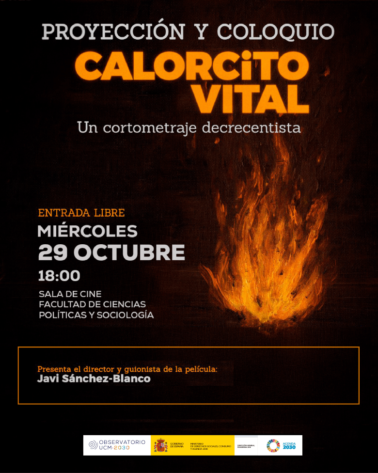 Calorcito Vital es una fábula simbólica decrecentista que cuenta la historia de tres mujeres que se refugian en una vieja cabaña de madera durante una implacable tormenta de nieve. Cuando una de ellas tiene un plan para mejorar su situación, aquello que comienza como un alivio temporal se convierte en una peligrosa obsesión. A partir de la proyección del cortometraje, presentado por su director y guionista Javi Sánchez-Blanco, se generará un coloquio abierto con el público para explorar los símbolos y las tesis principales de la obra, buscando llegar de esta forma a las ideas clave del decrecimiento.