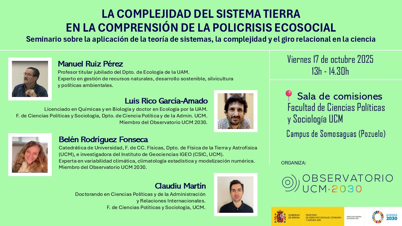 Este seminario se concibe como un primer acercamiento a la teoría de sistemas y a sus aplicaciones para abordar la complejidad desde una perspectiva transdisciplinar. Por ejemplo, desde la teoría de juegos para simular el comportamiento de una pesquería, para desarrollar modelos climáticos que permitan entender su relación con las reservas pesqueras, o para el análisis del desarrollo de los regímenes iliberales y su incapacidad para abordar la complejidad.
