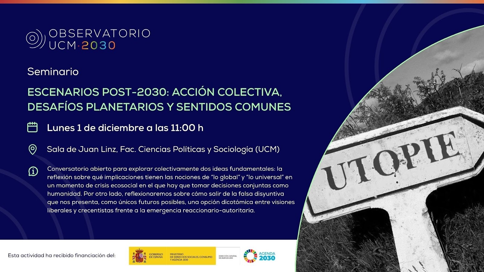 El pasado 1 de diciembre organizamos el seminario "Escenarios post-2030: Acción colectiva, desafíos planetarios y sentidos comunes". Un conversatorio abierto para explorar colectivamente dos ideas fundamentales: por un lado, la reflexión sobre qué implicaciones tienen las nociones de “lo global” y “lo universal” en un momento de crisis ecosocial en el que hay que tomar decisiones conjuntas como humanidad. Por otro, reflexionamos sobre cómo salir de la falsa disyuntiva que nos presenta, como únicos futuros posibles, una opción dicotómica entre visiones liberales y crecentistas frente a la emergencia reaccionario-autoritaria.